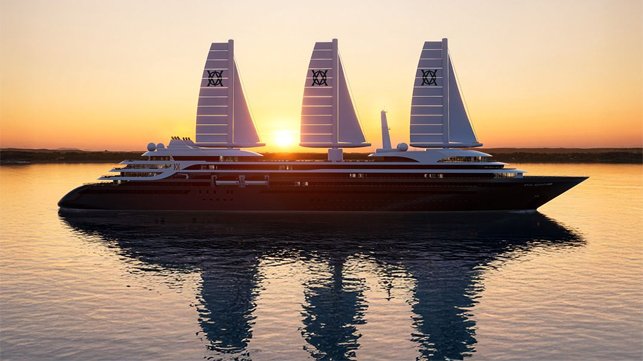 Named Atlas Adventure, the ship, which will be 26,000 gross tons, will measure 690 feet (210 meters) in length. It will have an Ice Class 1B (Polar Category C) hull to permit Arctic and Antarctic expeditions, and the most striking feature is the large carbon-fiber sails, which will give the ship an air draft of 225 feet (68.5 meters).