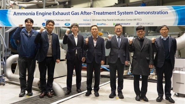 Korean Register (KR) announced the successful development of an exhaust gas after-treatment system for ammonia-fueled engines, following the completion of a land-based demonstration and showcase. The system achieved a 95% reduction in nitrogen oxides (NOx) emissions and a 99.7% reduction in ammonia (NH?) emissions, while reducing ammonia slip from an initial level of 10,000 ppm to 30 ppm.