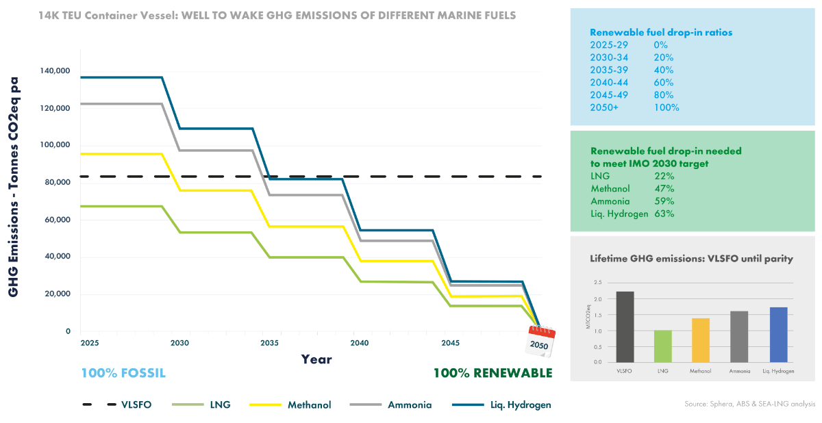To illustrate the implications of fuel pathways for the climate and for shipowners, SEA-LNG developed an example investment decision illustrating a duel-fuelled 14,000 TEU container vessel coming into operation in 2025 and operating for 25 years in a market for e-fuels that is increasing in scale from 2030 onwards.
