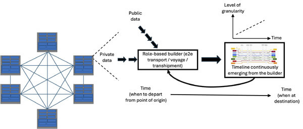 Each Builder aggregates timestamps, from the member’s/user’s own system or those shared by other members. Enriched by public data, such information raises situational awareness and improves the accuracy of members’ analyses and calculations. An e2e transport Builder for example incrementally builds the itinerary/vision of a specific transport/logistics chain. Each additional data point enlarges horizons and increases the granularity of analysis.