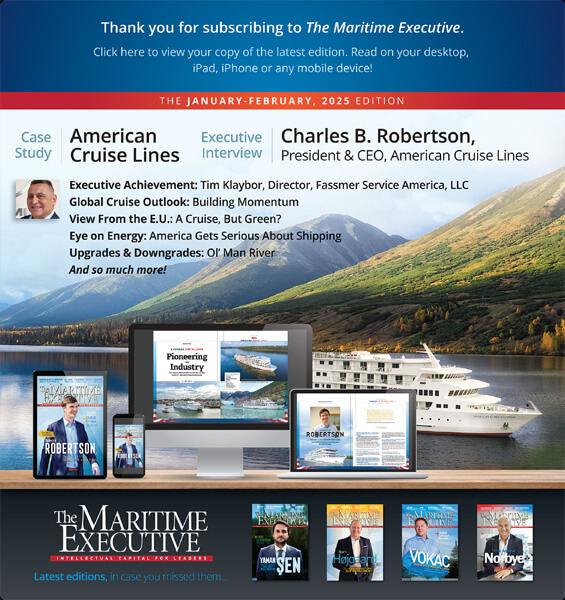 To read the latest edition of the magazine, go to The Maritime Executive January/February 2025 Passenger Vessel Issue. To subscribe to the magazine, please go to https://www.maritime-executive.com/subscribe.